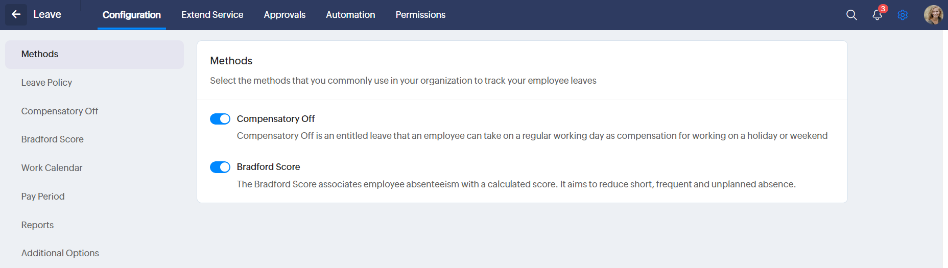Leave service is primarily about facilitating the management of employee absences in your organization. It involves adding leave policies and setting up preferences for compensatory time-off, work calendars, pay periods and more. It also includes managing permissions related to employee leave data and related settings.