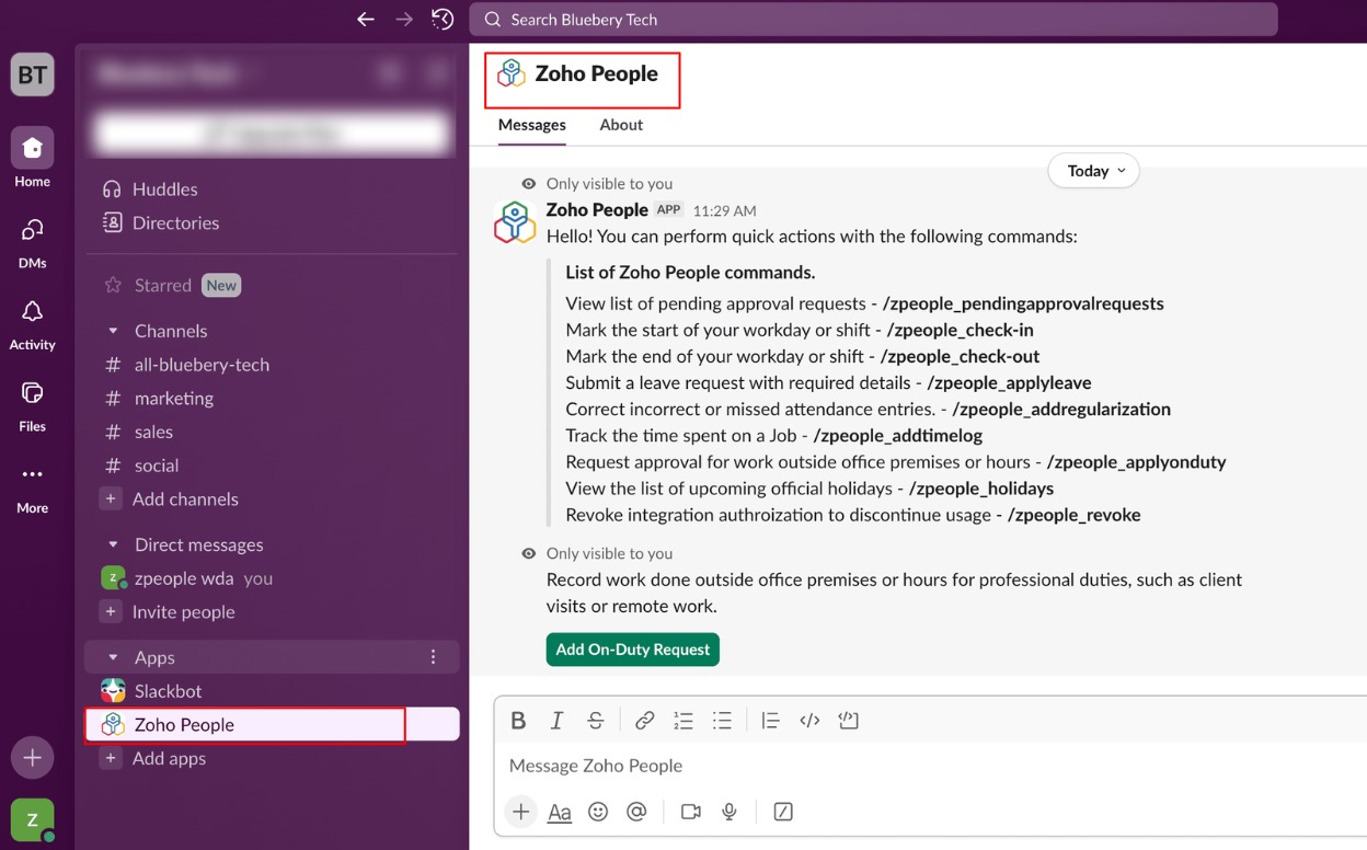 Requirements: Zoho People paid account and a Slack account.If you are a Zoho People administrator, set up the Slack integration through the Zoho People marketplace and configure the required approval notifications to be sent to Slack.