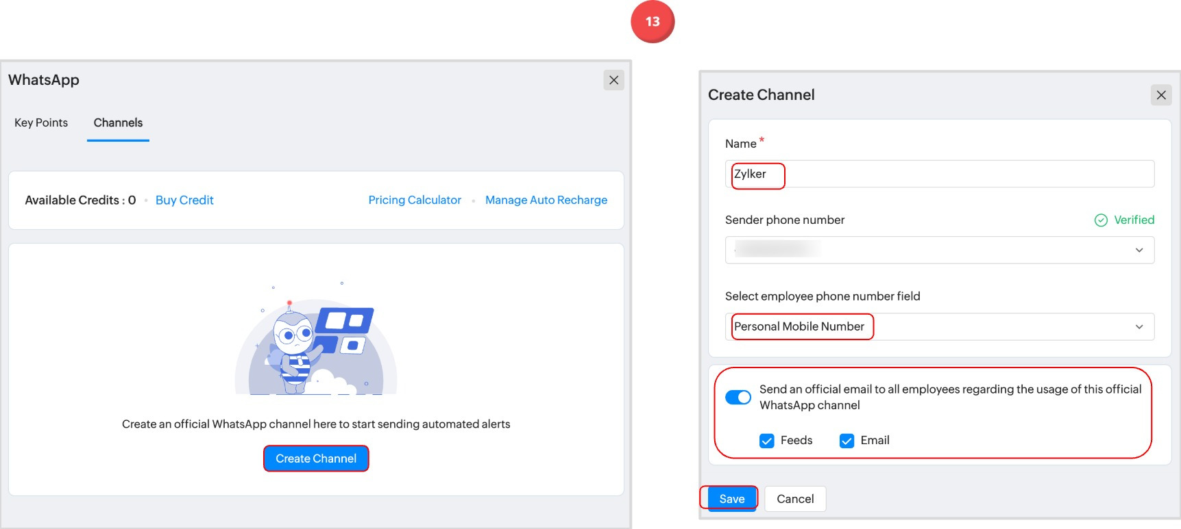 13. You will now see the "WhatsApp business account linked successfully" message in Zoho People. (Move back to the Zoho People tab in your web browser). Now proceed by clicking on the Create Channel button. (Settings > Marketplace > Third-party integrations > View Details within WhatsApp > Channels > Create Channel). During channel creation, the user will be prompted to enter the channel name and select the employee form field to be used for obtaining the employee mobile numbers. Additionally, you have an option to send a notification on feeds and email about the usage of WhatsApp in your organization.