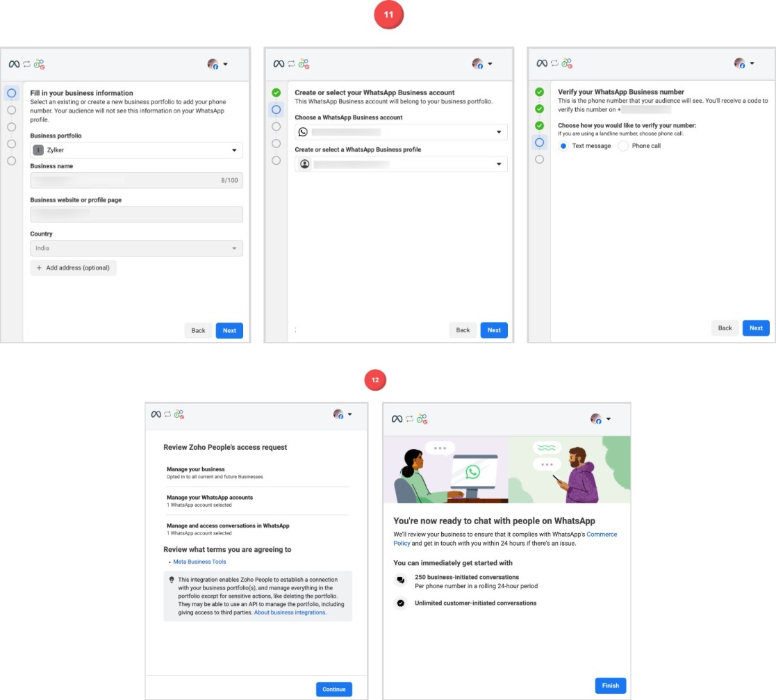 11. Next, you will be presented with a 5-step wizard that takes you through the account setup. Fill in the required details; you will also be prompted to select the corresponding Whatsapp business account, select a verified phone number (or verify a new one). Proceed through each stage to complete this process.