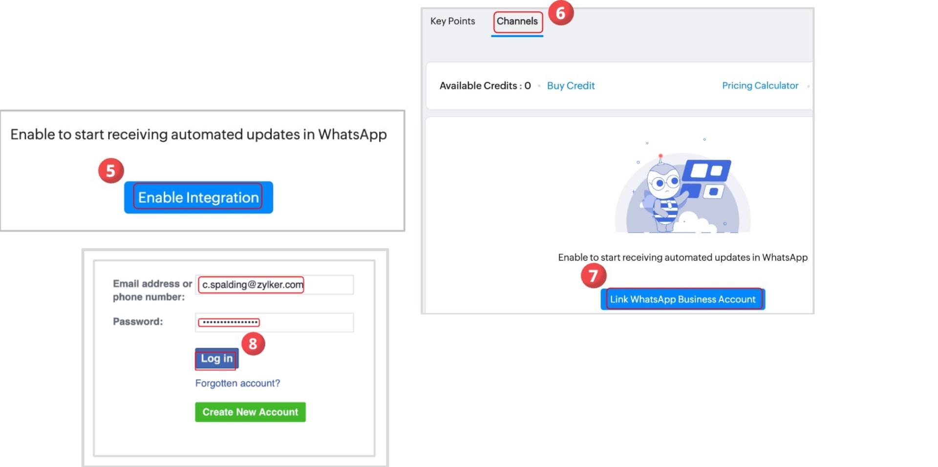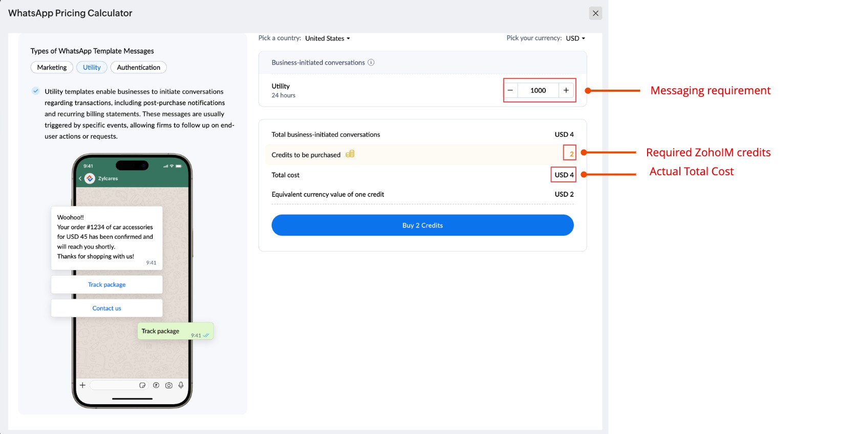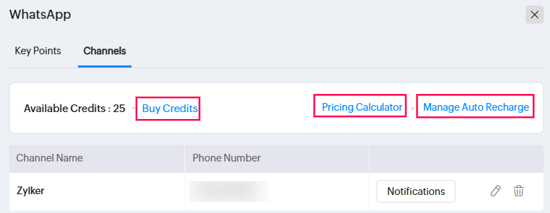 15. Now, for the notifications to be sent, it is mandatory to purchase ZohoIM credits, which will be deducted for messages sent from WhatsApp. Please read the topic below for more details on pricing.