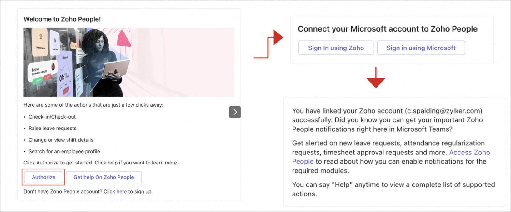 NotesNote: Authorization must be done at a user level (all users using Microsoft Teams in your organization must individually authorize). Approval notifications will be received in both Zoho People and Microsoft Teams.