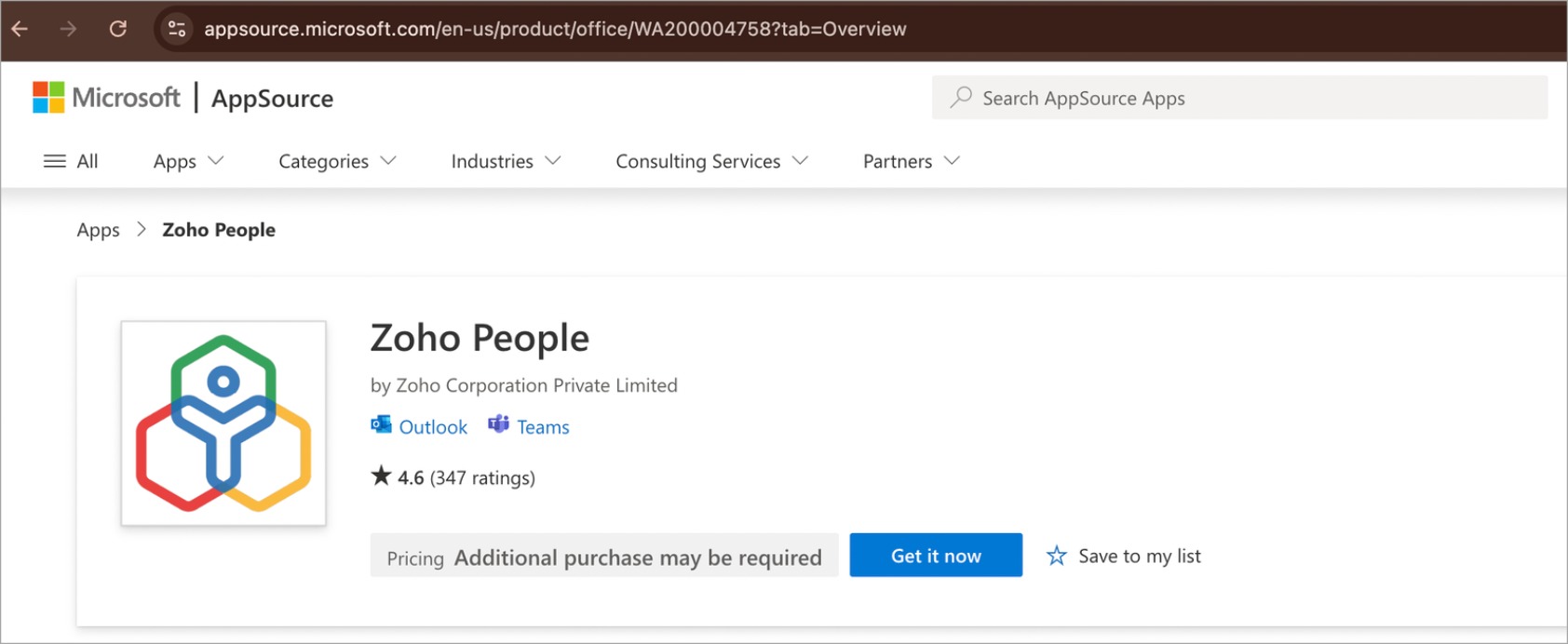 2. Install Zoho People for Microsoft Teams by clicking on Get it now.