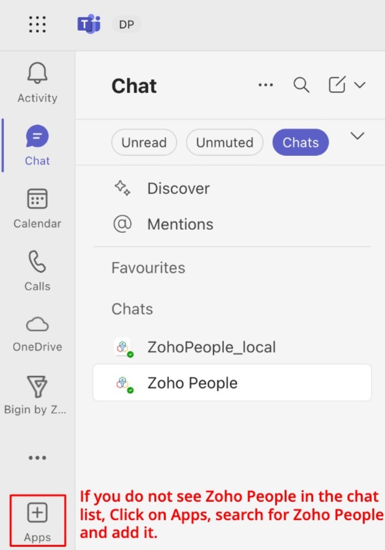 If you have multiple chatbots or conversations in your Microsoft Teams chat space, scroll and click on Zoho People. (Individual chat only, actions cannot be performed from group chat spaces) this is where you will receive notifications and issue actions.