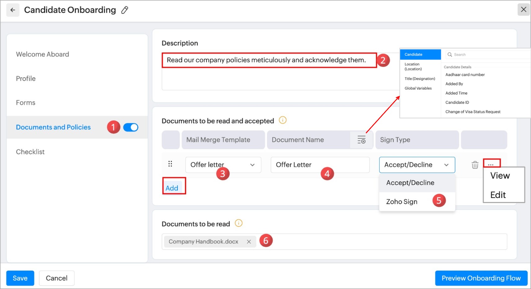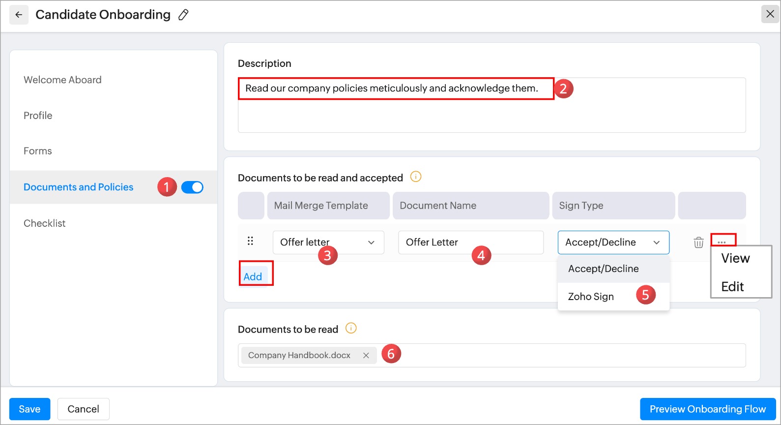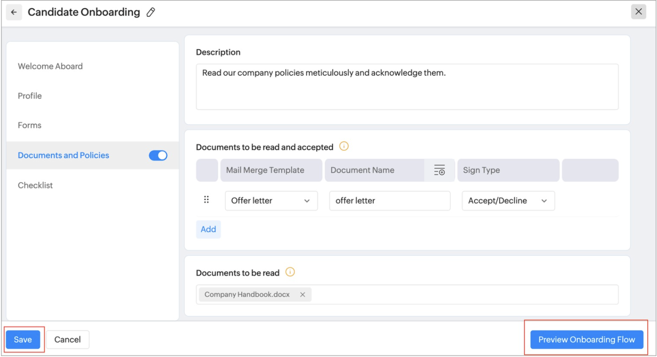Add documents such as policies or your organizational documents that are to be read by the candidate during their onboarding process.