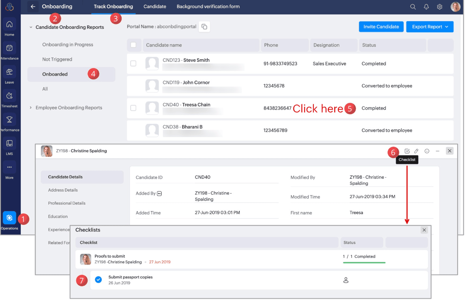 Once the candidate completes the onboarding process, administrators can validate and complete the checklist. Checklist for the candidate record is available in Operations > Onboarding > Candidate Onboarding Reports > Onboarded. Click on the record to view and complete the checklist.
