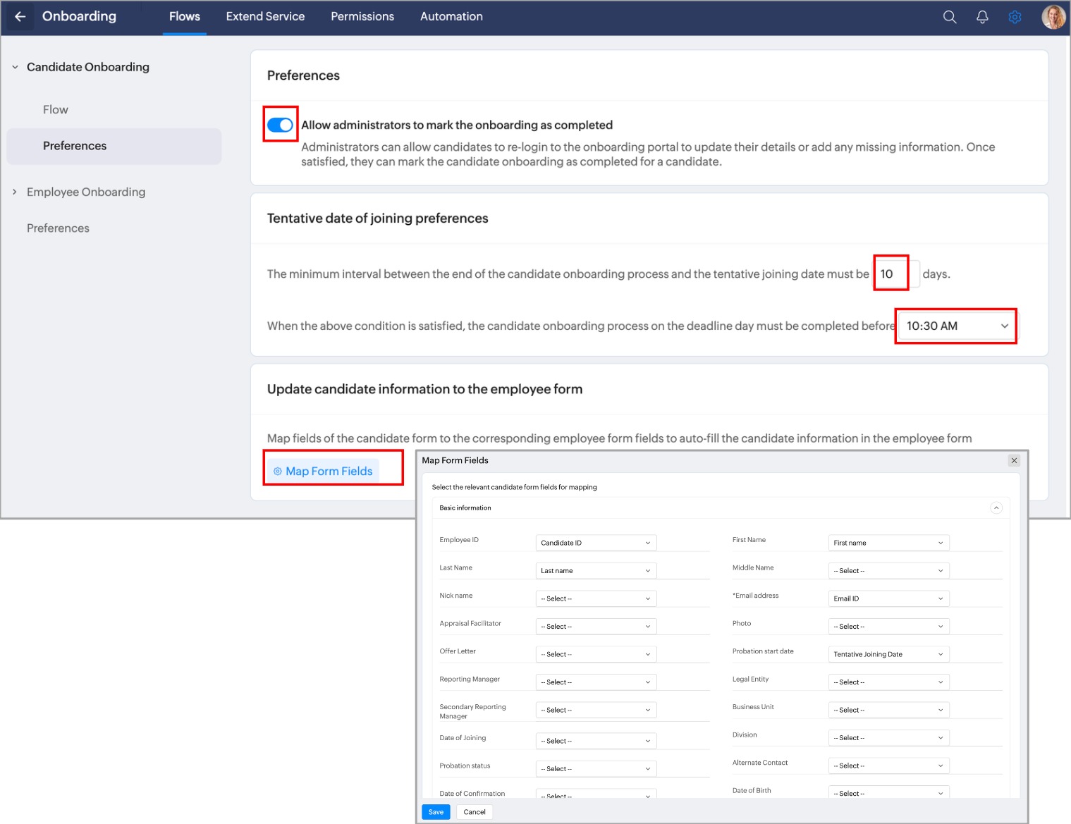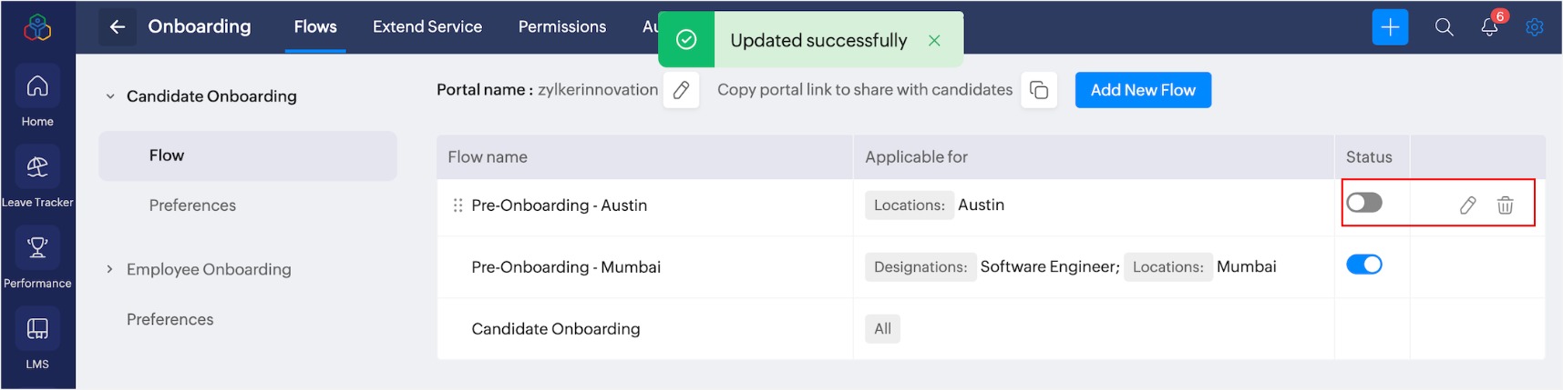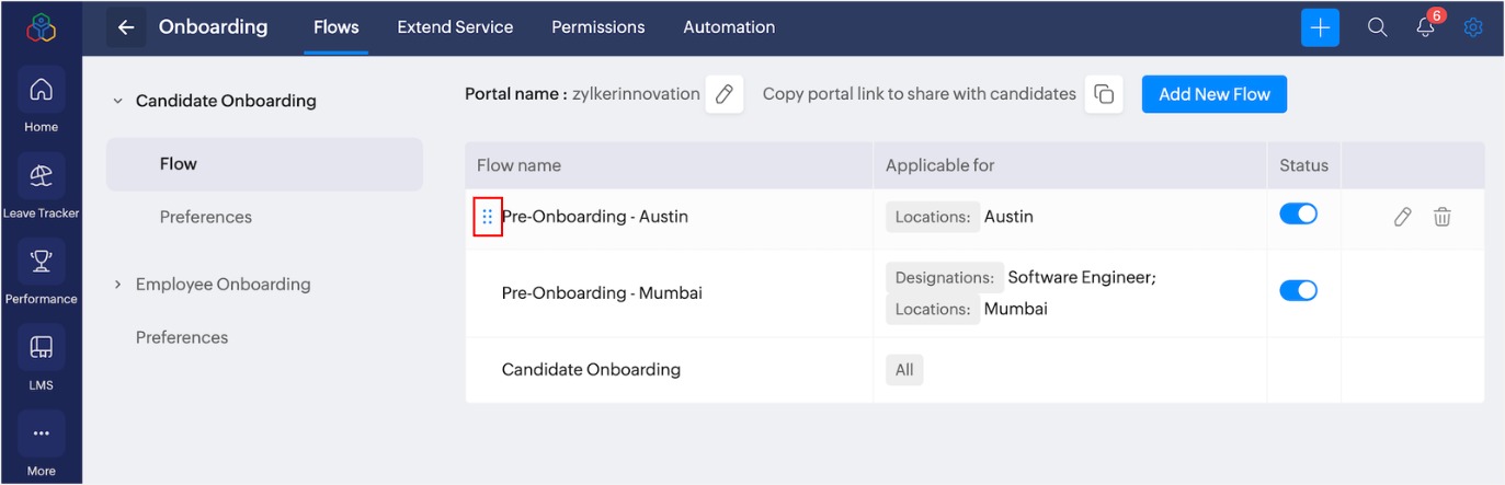You can create multiple Candidate Onboarding flows for your organization, which enables you to conduct a personalized onboarding process for your new hires based on their work location and designation.