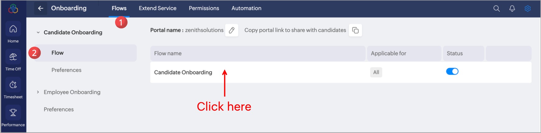 If you are a first time user, navigate to Settings > Onboarding > Flows > Candidate Onboarding > Flow, and enter your Candidate Onboarding portal name.