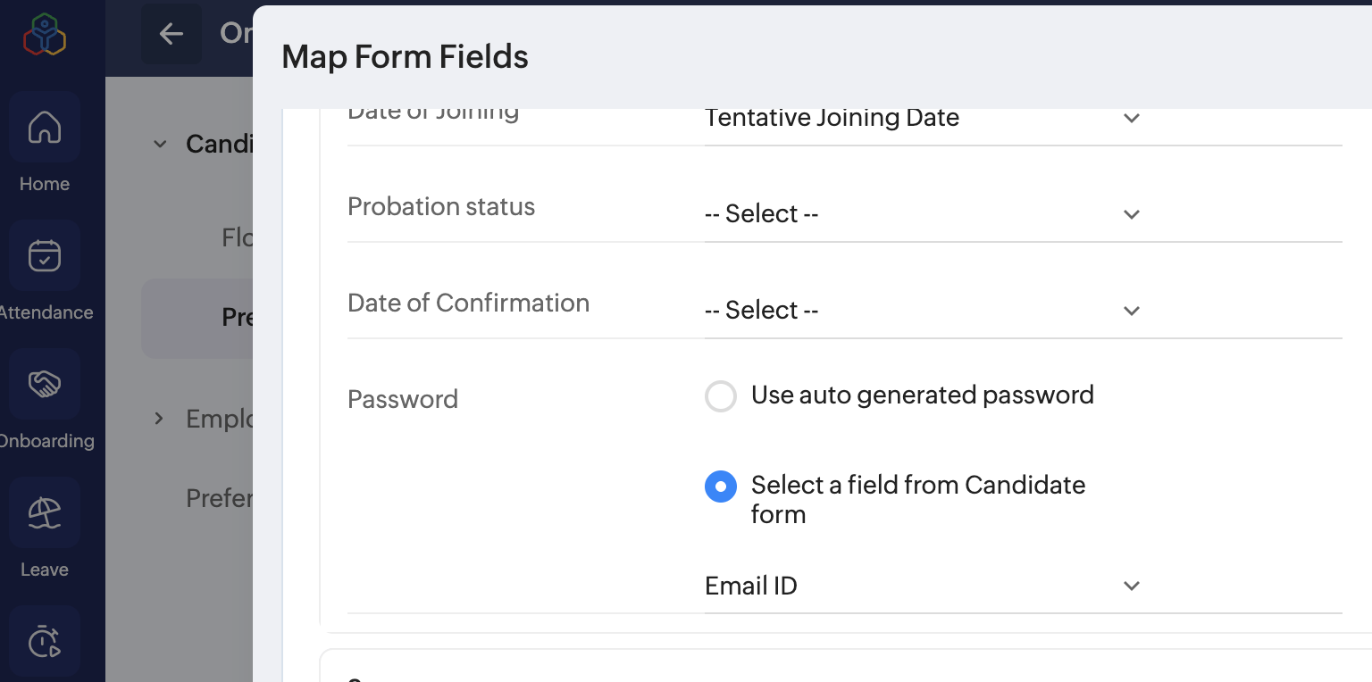 You can set the password preference to either auto-generate or use a field from the candidate form in the