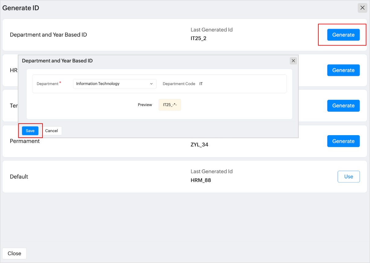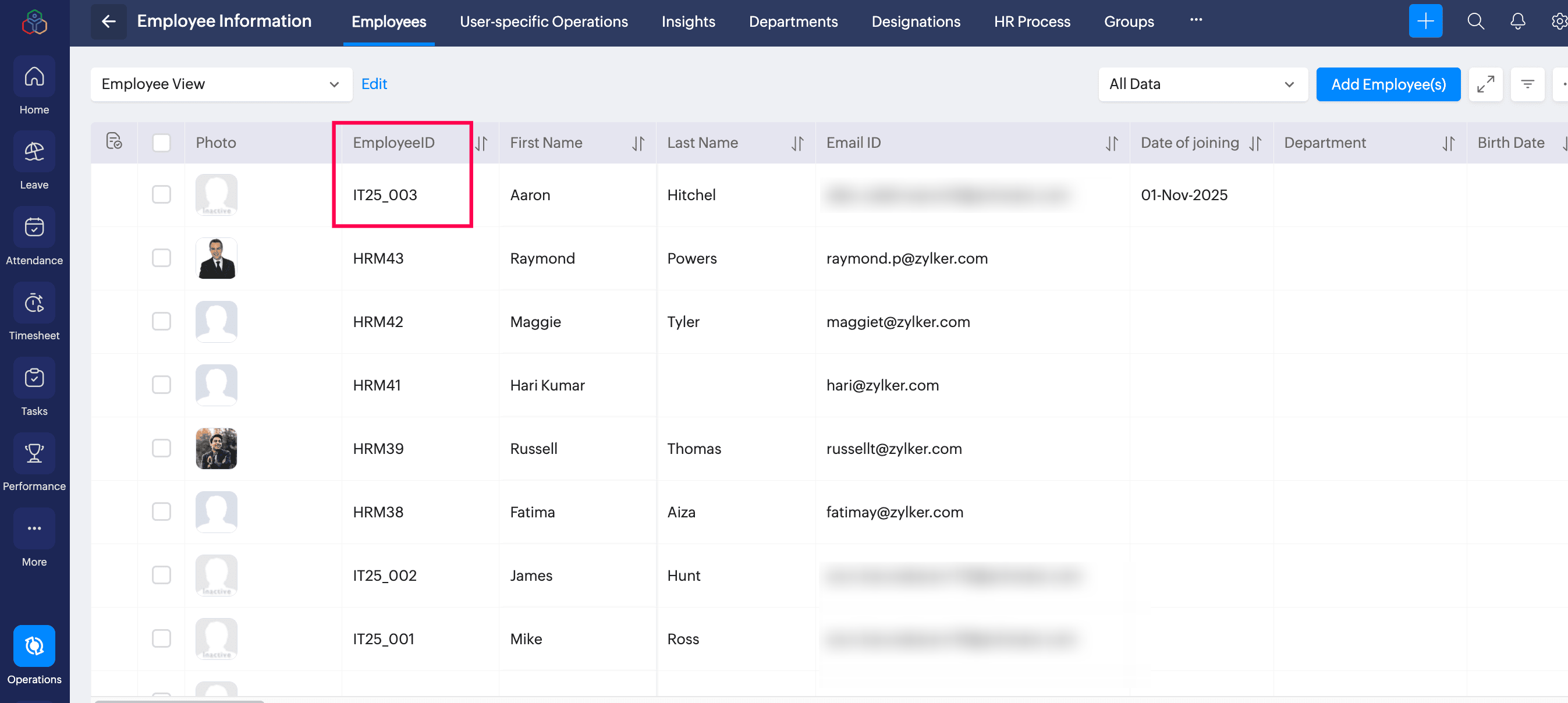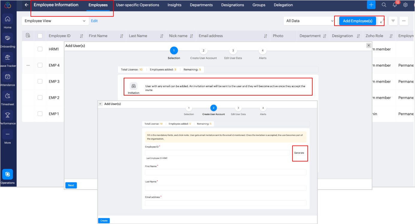 Employee ID Generation must be enabled and configured in Zoho People to generate Employee IDs when converting a candidate to an employee or adding users directly in Zoho People.