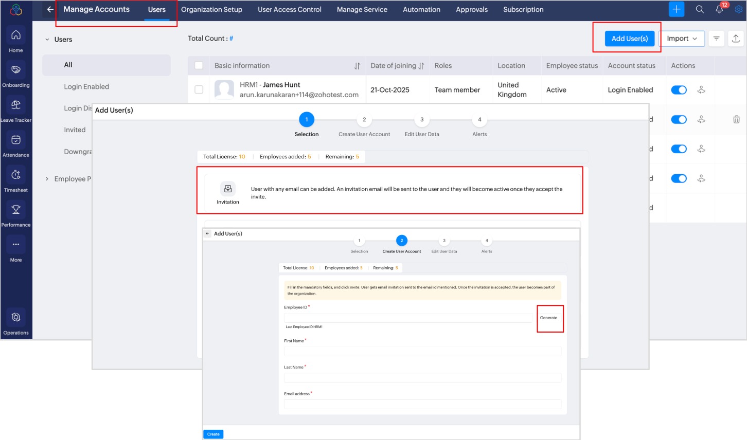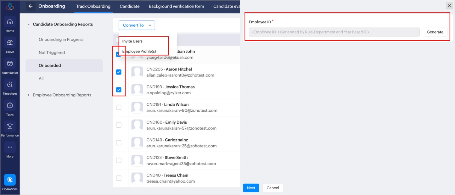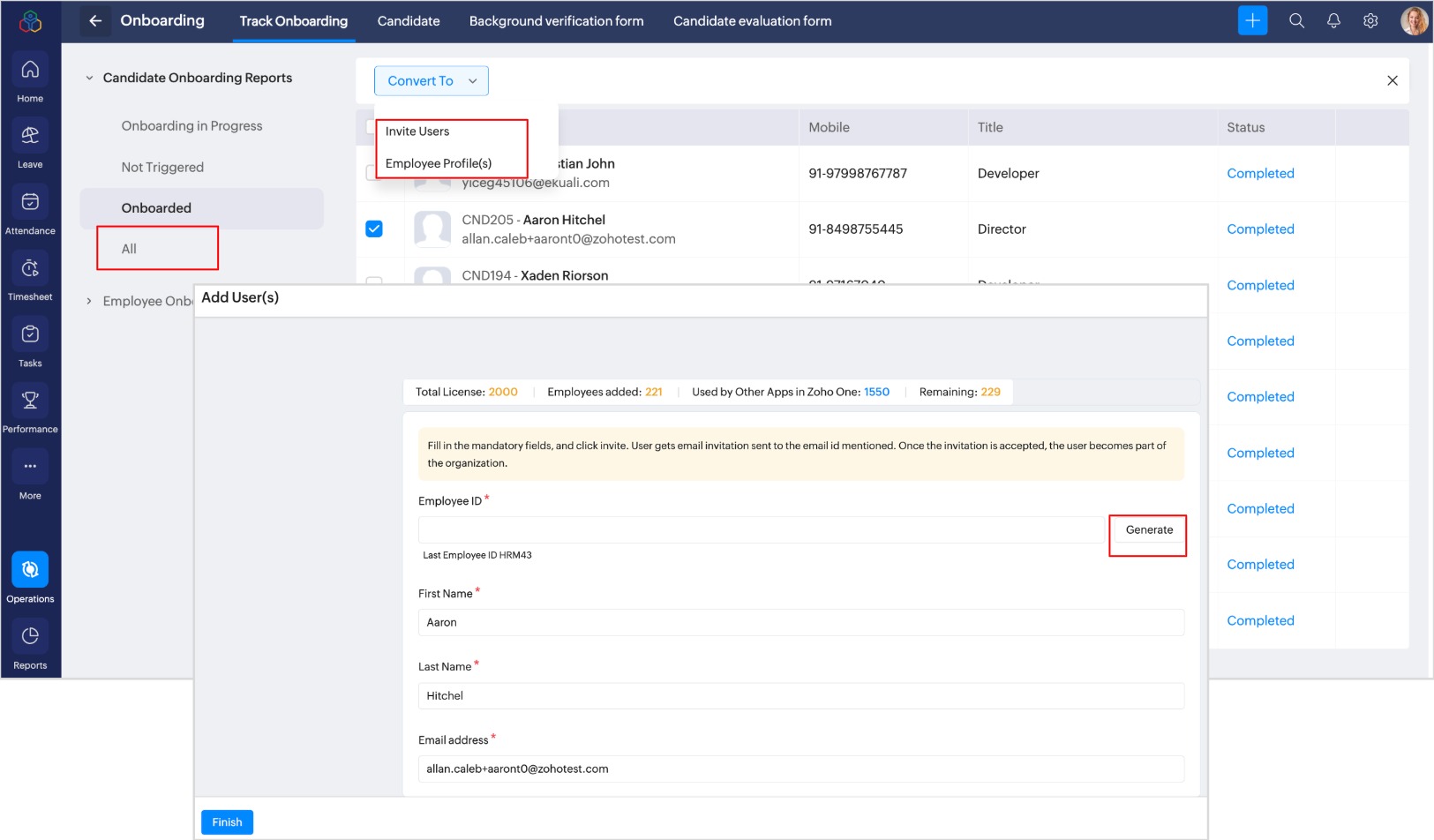 Employee ID Generation must be enabled and configured in Zoho People to generate Employee IDs when converting a candidate to an employee or adding users directly in Zoho People.