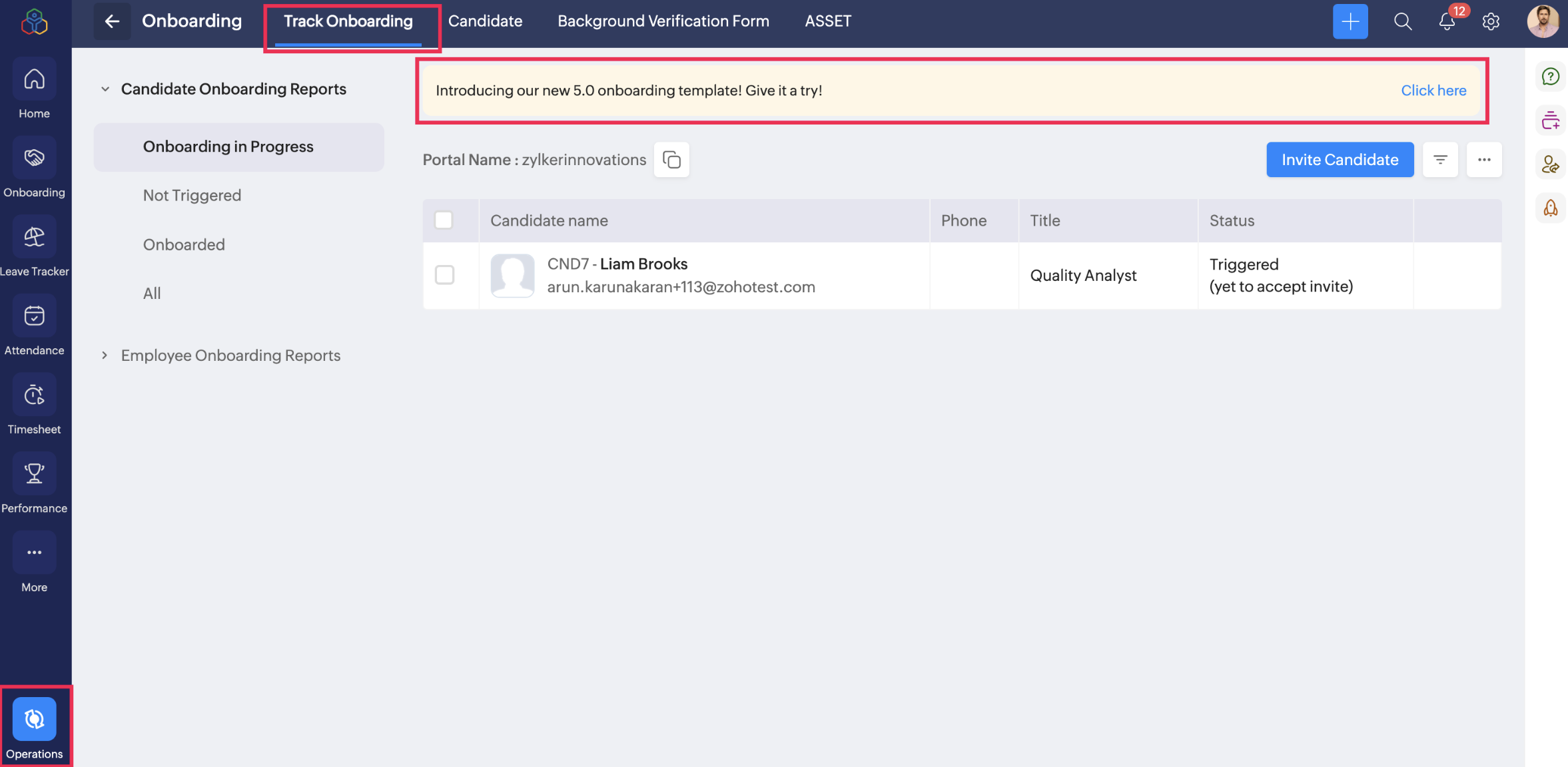 The Candidate Onboarding Reports section allows you to invite candidates and monitor their onboarding status. Once they have completed their onboarding, you can fill out the checklist, mark the candidate's onboarding as completed, and convert them to ...