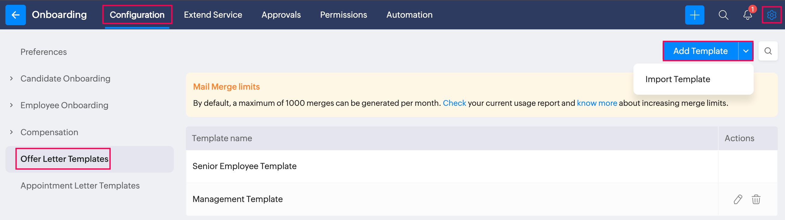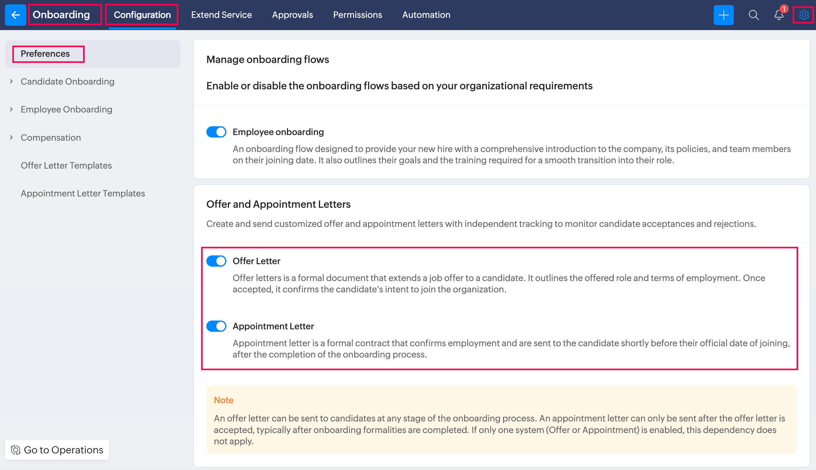 ⬡ Ensure that the Appointment Letter feature is enabled in Settings > Onboarding > Configuration > Preferences and the necessary mail merge templates to use are added in the Settings > Onboarding > Appointment Letter Templates tab.