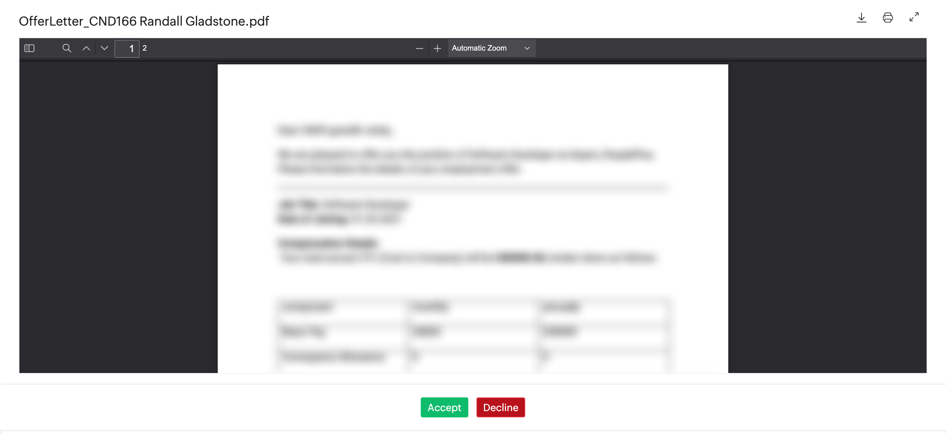 The offer letter will now be sent to the candidate. The candidate will receive an email with a link to access the offer letter. The candidate can choose to Accept or Reject the job offer.