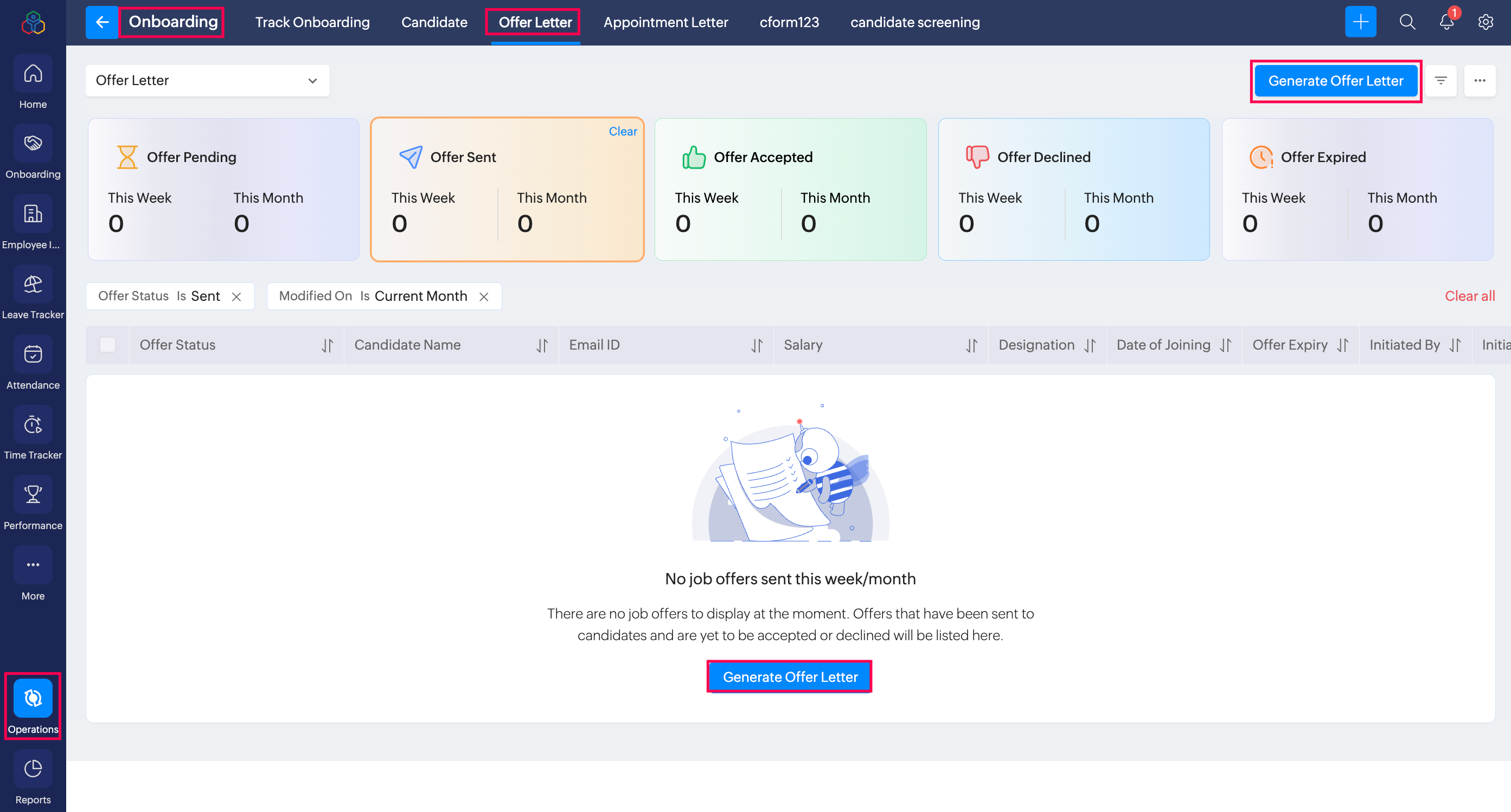Navigate to Operations > Onboarding > Offer Letter tab and click on the Generate Offer Letter button.