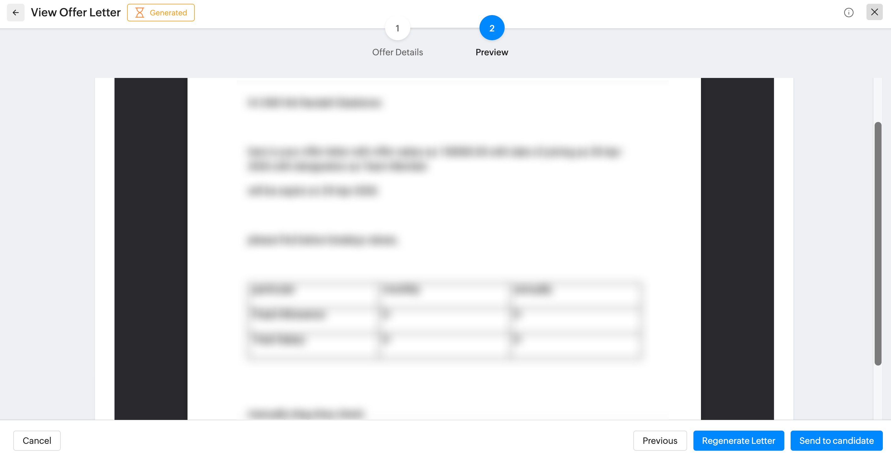 ⬡ If you want to make any changes to the offered salary, click on the Previous button and click the Regenerate button to get access to edit the fields.