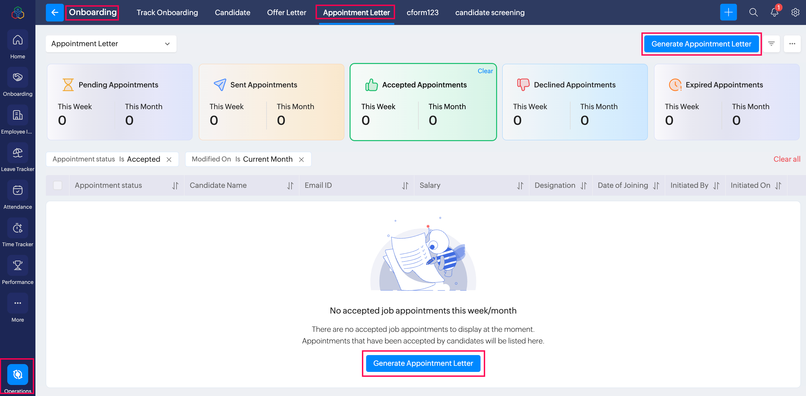 To track appointment letter status, navigate to Operations > Onboarding > Appointment Letter tab.