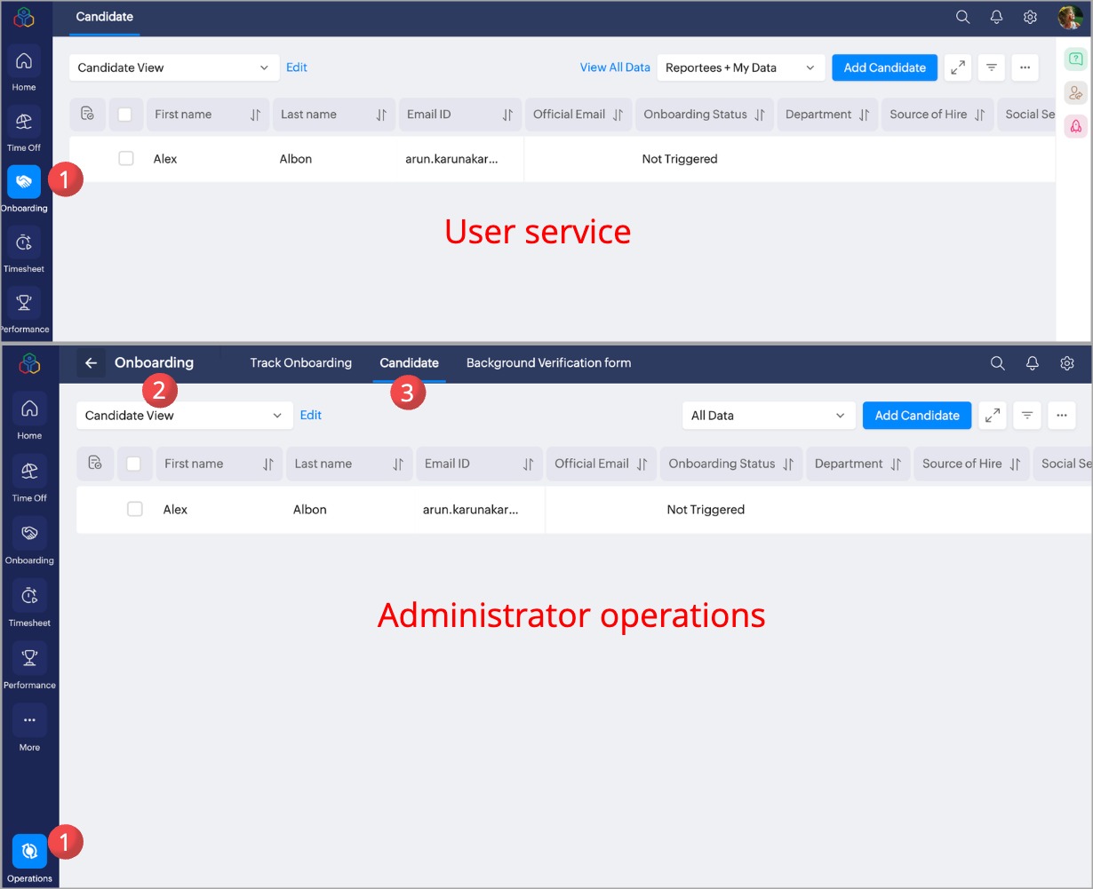 The candidate tab is available in Operations as well as User Service (left side tab), based on the permissions you can access the tabs from any of the interface and manage the candidate records.
