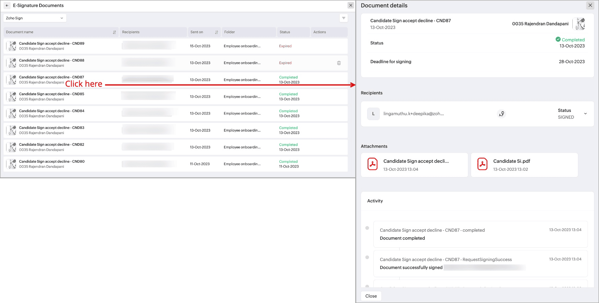 - The documents sent for e-signature to the candidates are listed here. Click on a record to view the e-sign Document details.