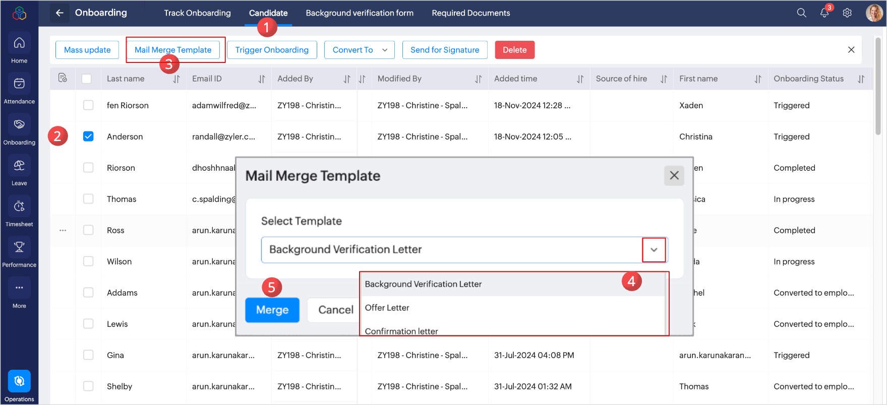The Mail Merge Template option allows you to send pre-formatted documents to multiple candidates at once. Use this option to send personalized letters, such as offer letters, background verification authorization letters, interview invitations, and more.