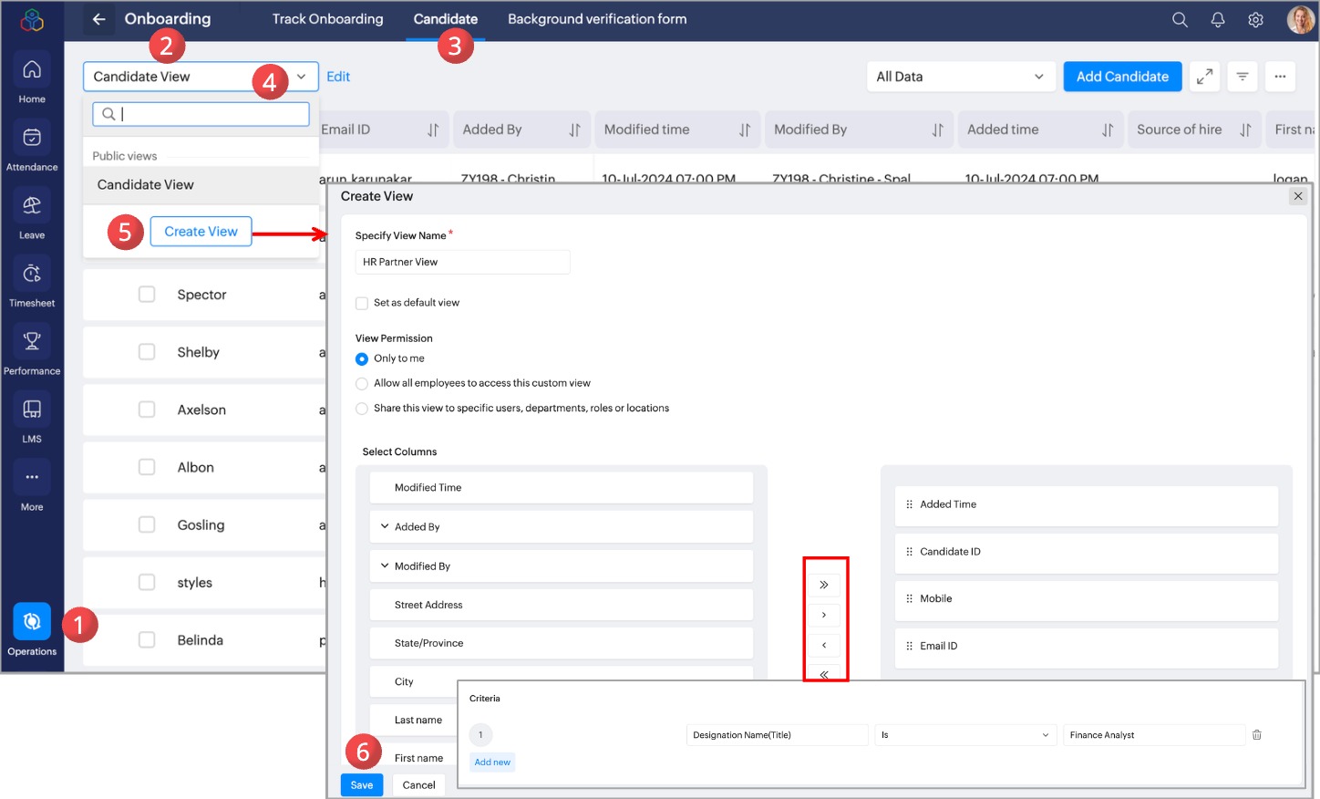 Create onboarding record view for customized viewing experience of the candidate onboarding records. You can set the view as default, set permissions for the view to make it accessible to employees who will be handling the candidate onboarding.