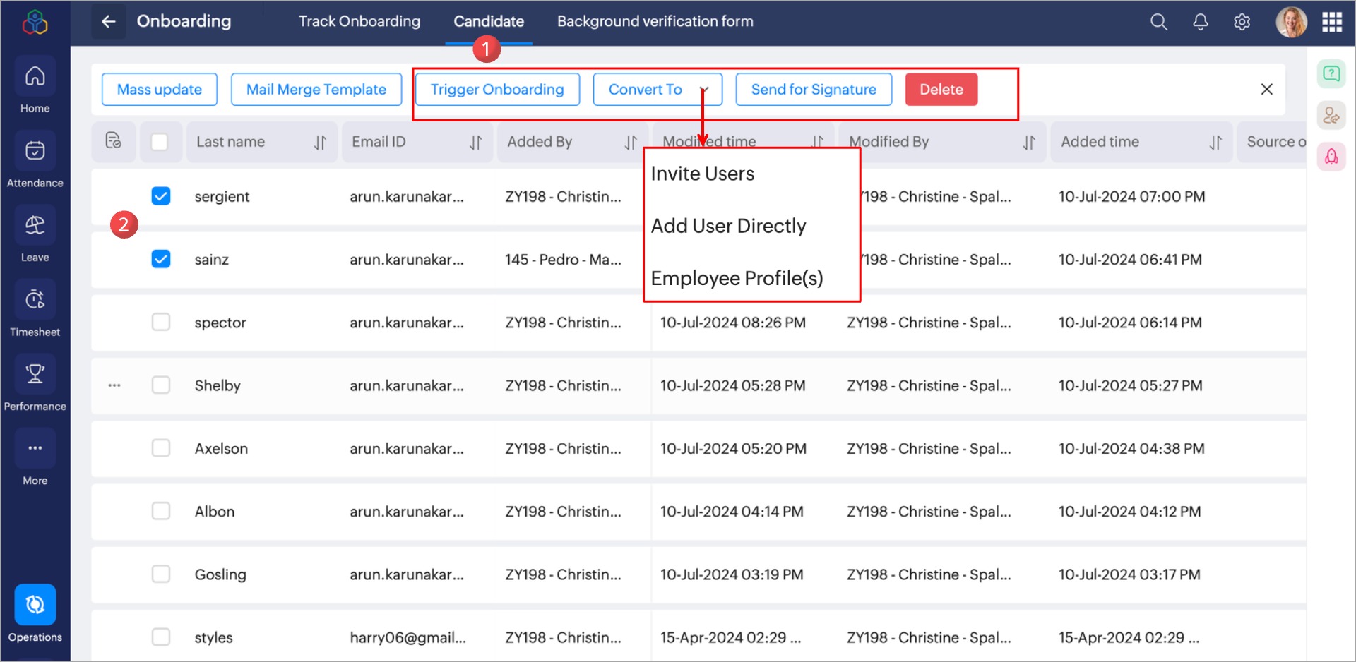 Select the candidate record to perform any of the following actions. To select the record, navigate to Onboarding > Operations > Candidate, and select the check box of the records.