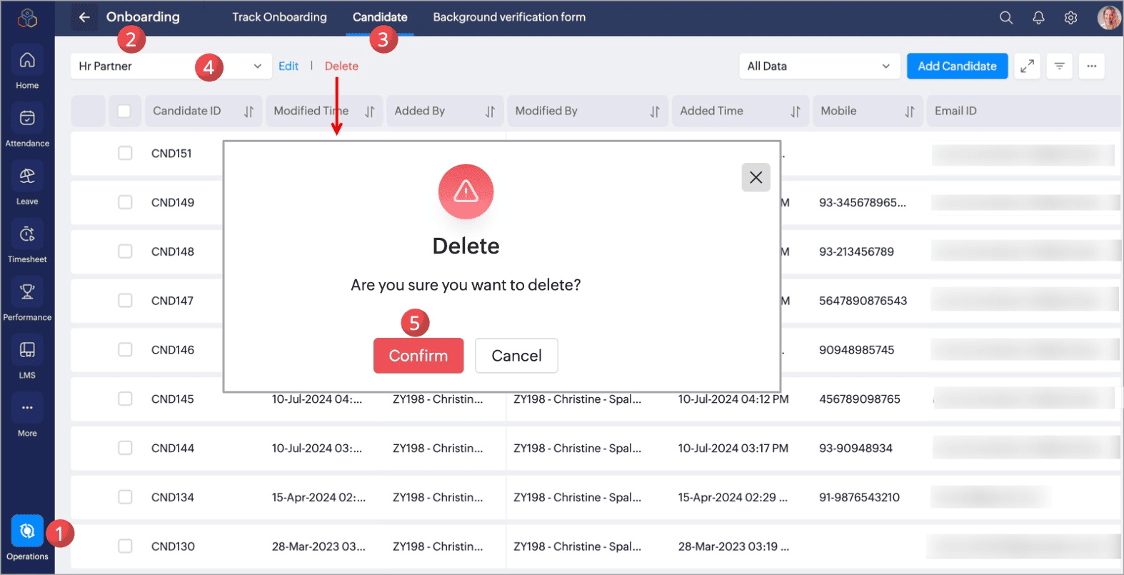 To delete the candidate, select the required candidate records and click Delete.