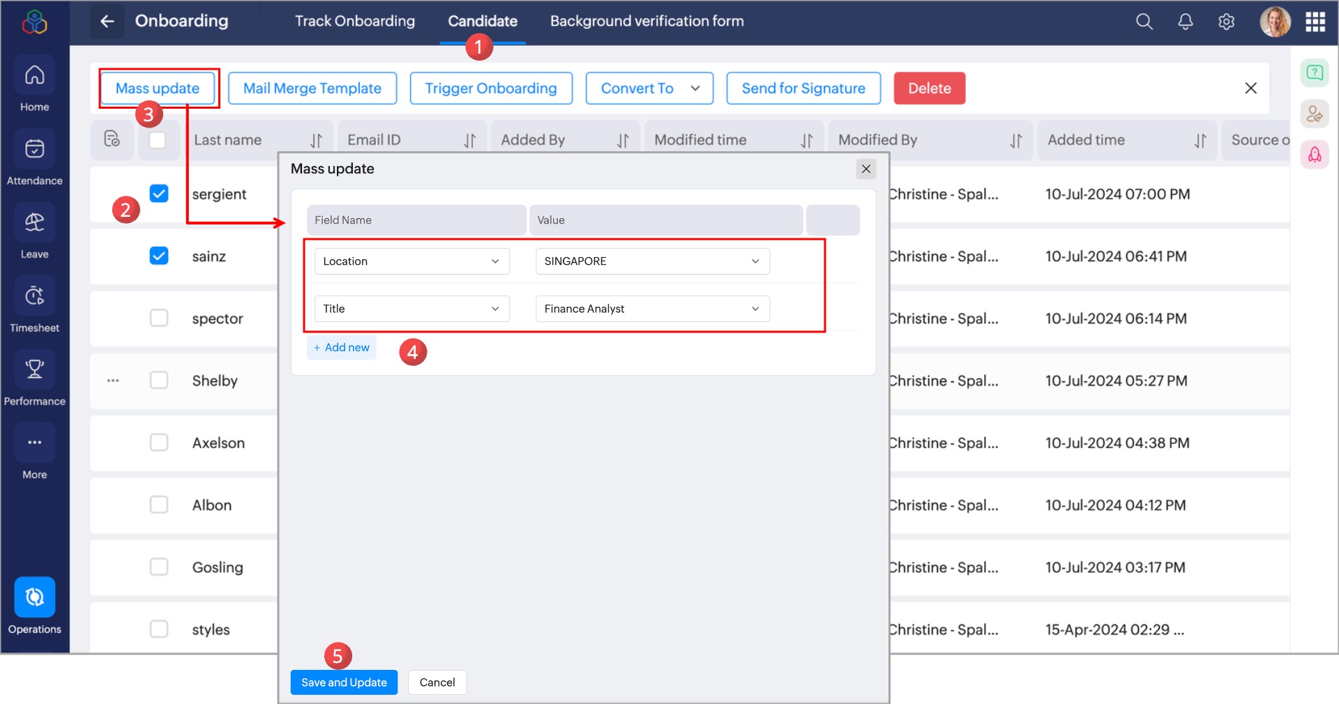 This option allows you to mass update the candidate record field values. You can multi select the records and update their form field information at once as provided in the below image.