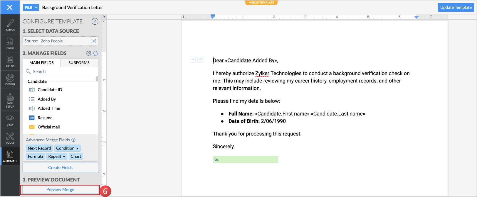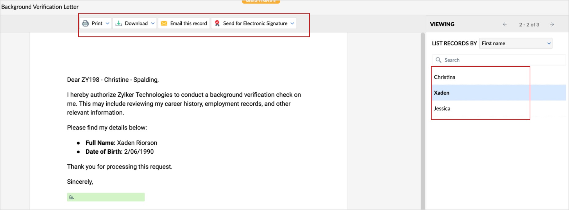 - The merge document for each selected candidates will be displayed.