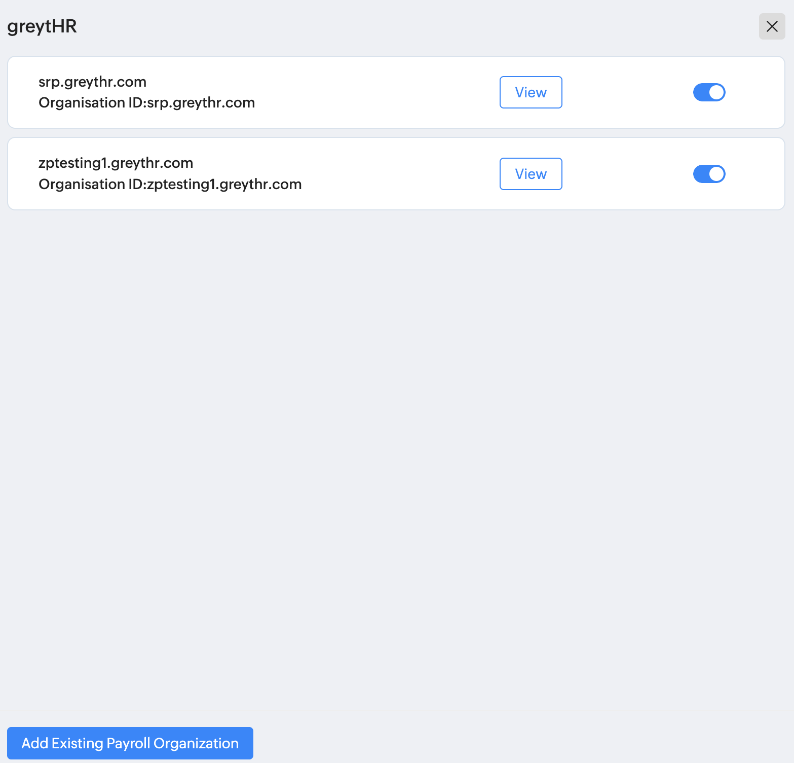 If your organization operates across multiple entities with separate greytHR accounts (for example, two different entities in varied locations), you can link these accounts using the Add Existing Payroll Organization button. Simply add additionals account to integrate. Use the View button to see details for each linked account, and toggle the switch to enable or disable sync for that specific account.
