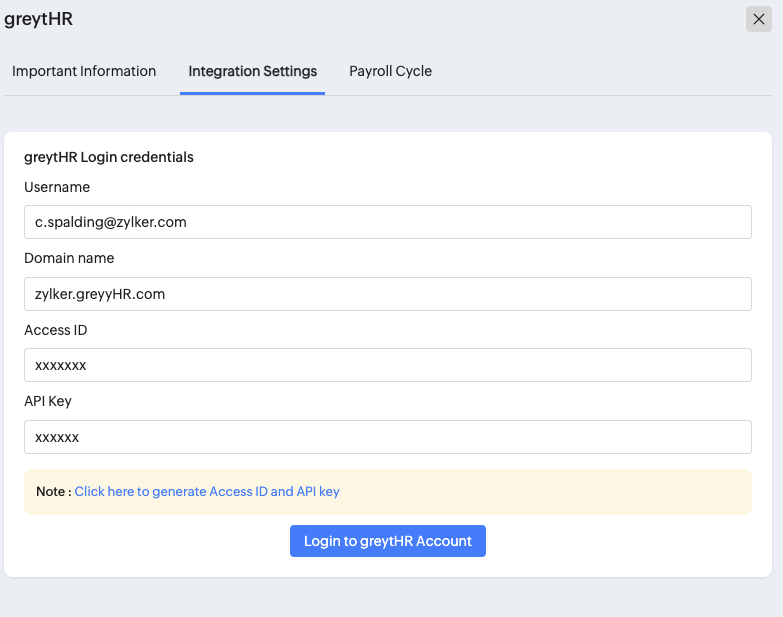Click the link in the Integration Settings page to learn how to generate the Access ID and API key. - Click Login to greytHR Account.