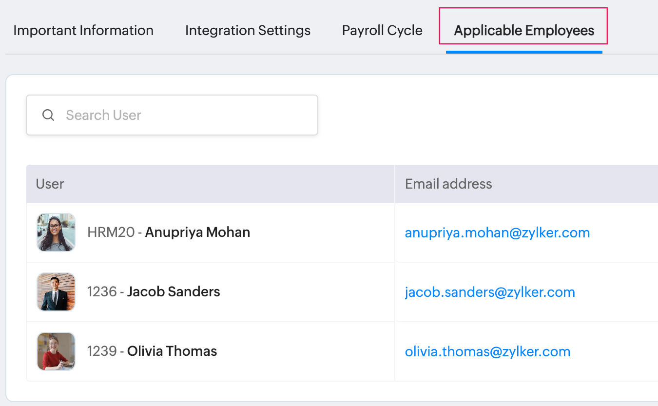 This tab lists the employees for who the payroll sync configuration is applicable for. To view the applicable list go to the