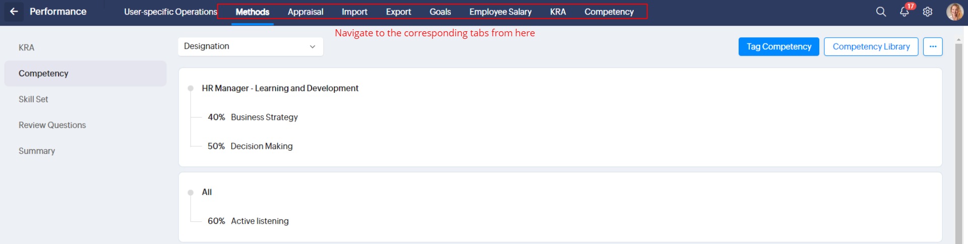 Performance service operations is a centralized space to handle all employee performance data. This includes tagging KRA, Competency, Skill Sets, adding and starting appraisal cycles, manage goals and more. Performance aspects of a particular employee can also be viewed and managed here.