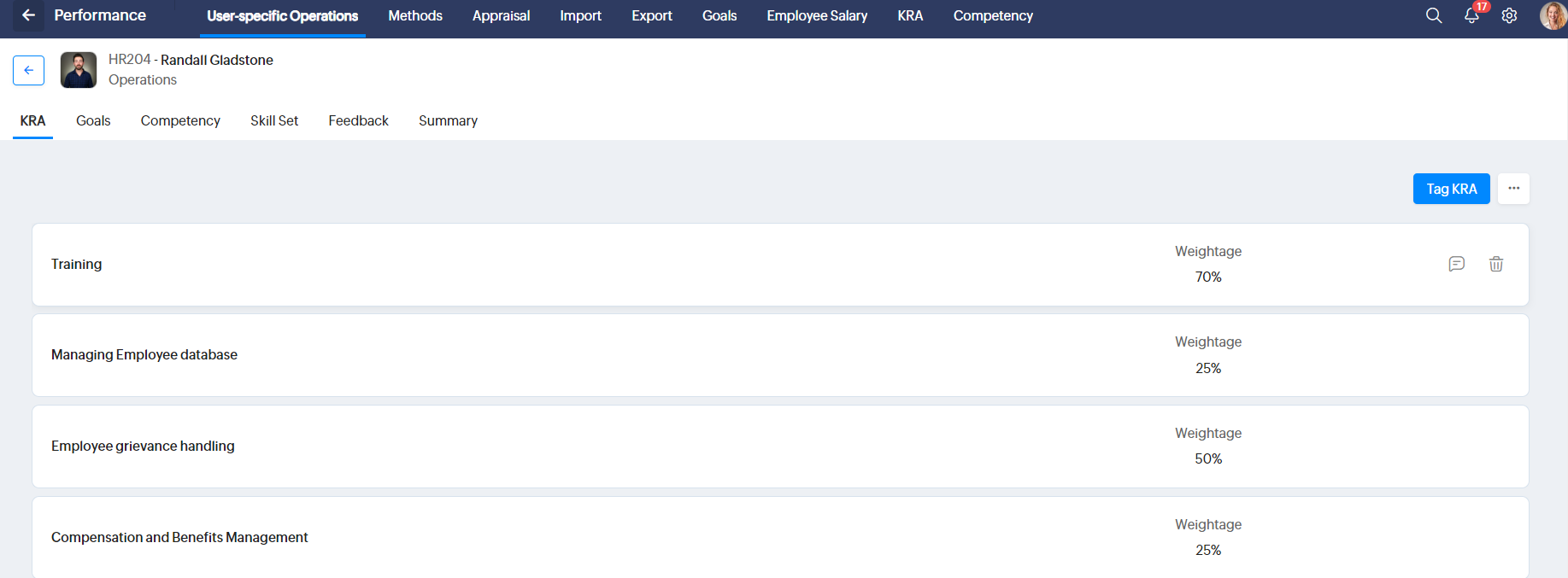 To tag KRA to specific employees navigate to Operations > Performance > KRA tab