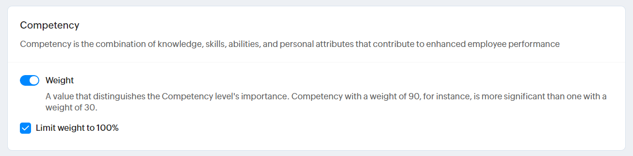 When enabled, A weight value is associated with competencies. For example, a competency with a weight of 90 is of more significance than a competency with a weight of 50. Enable "limit weight to 100%" if required, this ensures that the sum of the defined weight does not exceed 100.