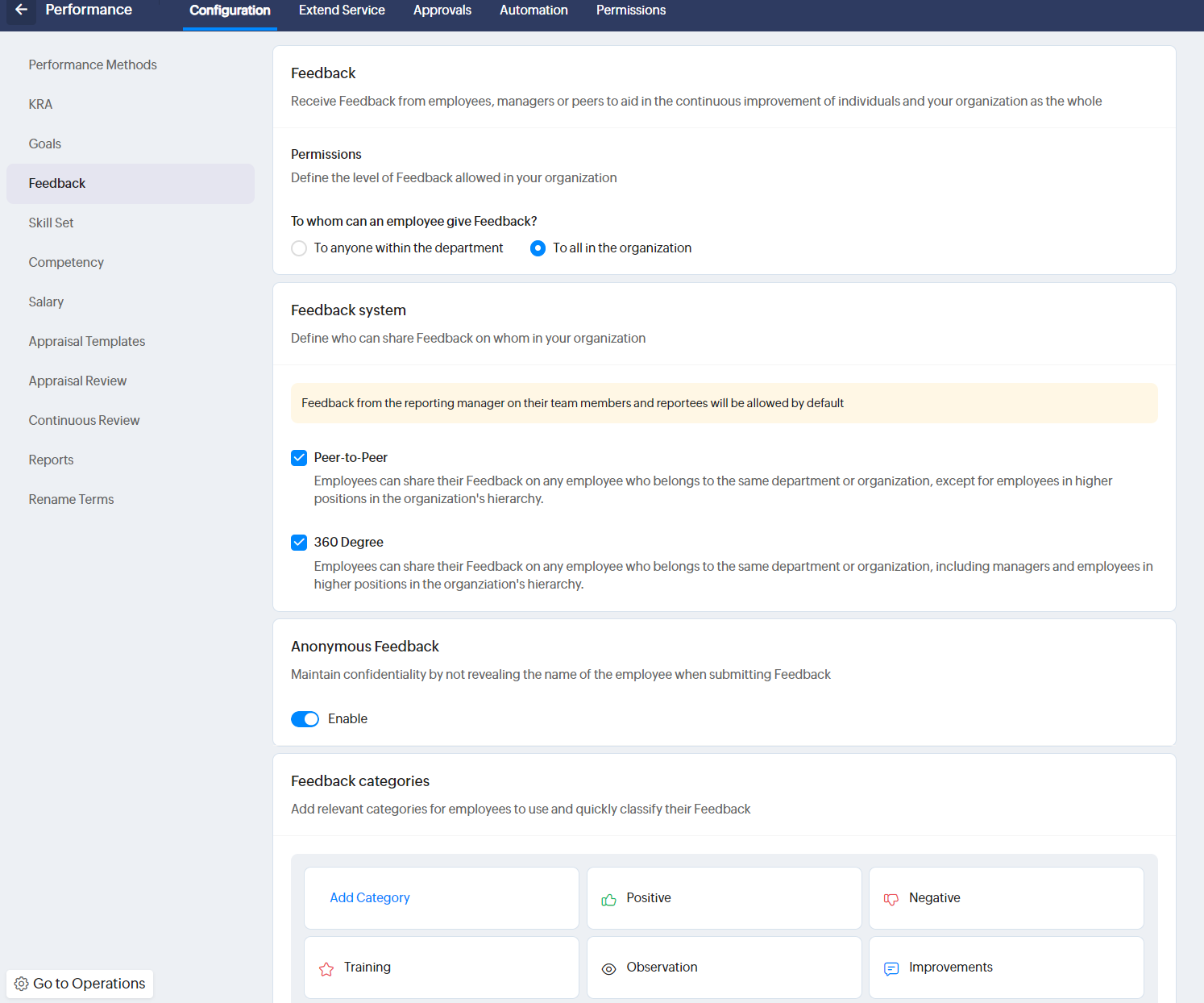 To configure feedback settings, navigate to Settings > Performance > Configuration > Feedback tab