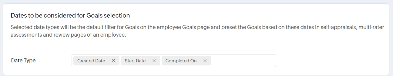 Selected date types will be the default filter for goals on the employee goals page and preset the goals based on these dates in self-appraisals, multi-rater assessments, and review pages of an employee.