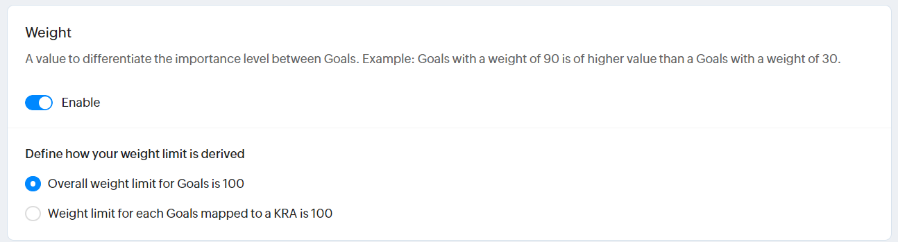 Associate a weight value with Goals. For example, a Goal with a weight of 90 is of more significance than a Goal with a weight of 50. Additonally, specify how the weight limit is derived here. When using Goals and KRA performance method, the weight of goals linked to a KRA can be limited to 100.