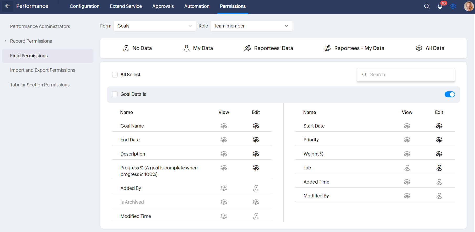 Default permissions for viewing, adding, editing and deleting goals are handled in Permissions > Field Permissions tab (view the second screenshot below). However, based on employee look-up fields in the employee form, additional employees can be granted access here.