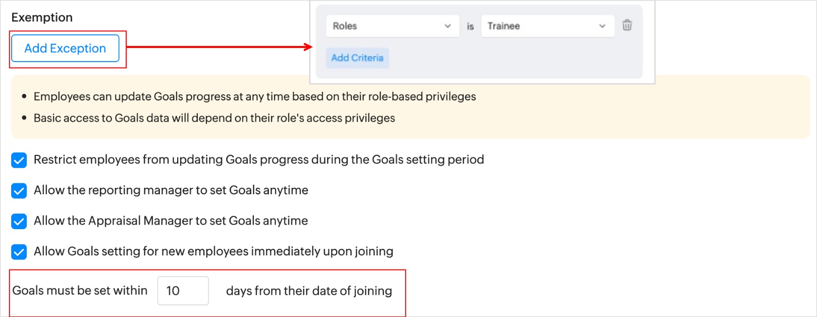 5. Under Exemption settings, you can exclude employees for whom goal setting is not applicable and select the required restriction and exemption checkboxes.