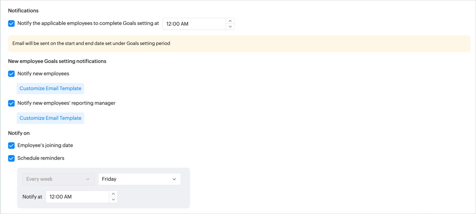 1. Enable notification and set time to notify all applicable employees to set goals. Email will be sent on the start and end date set under Goals setting period