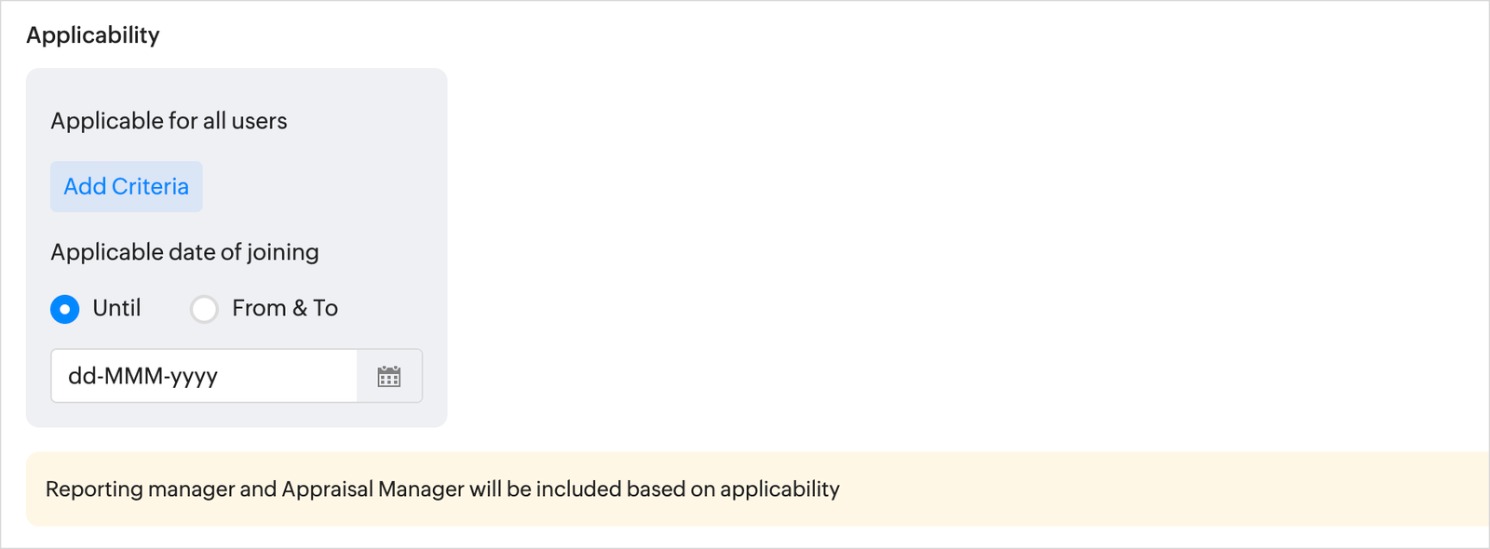 4. Set the goal setting applicability. By default, goal setting is applicable for all employees in your organization. You can restrict the goal setting for selective employees by adding specific criteria.