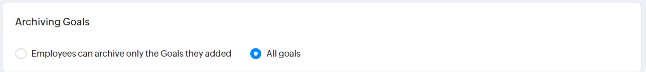 Archiving goals, if enabled allows employees to archive goals, this basically means, the goals that are no longer significant can be excluded by archiving them. Choose between allowing archiving of all goals or only the ones that the employees created themselves.