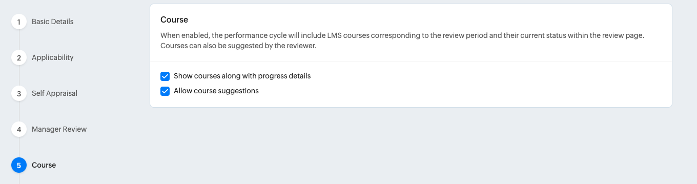 To use the integrated learning feature, during the creation of appraisal cycles, navigate to the Course tab and enable the required options.