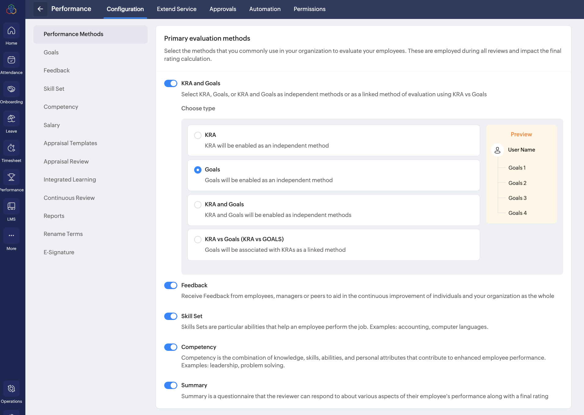 Once inside, use the tabs on the left listed under the main Configuration tab to manage all cruical aspects of the Performance Service. This includes enabling methods, configuring KRA, Goals, creating appraisal templates and more.