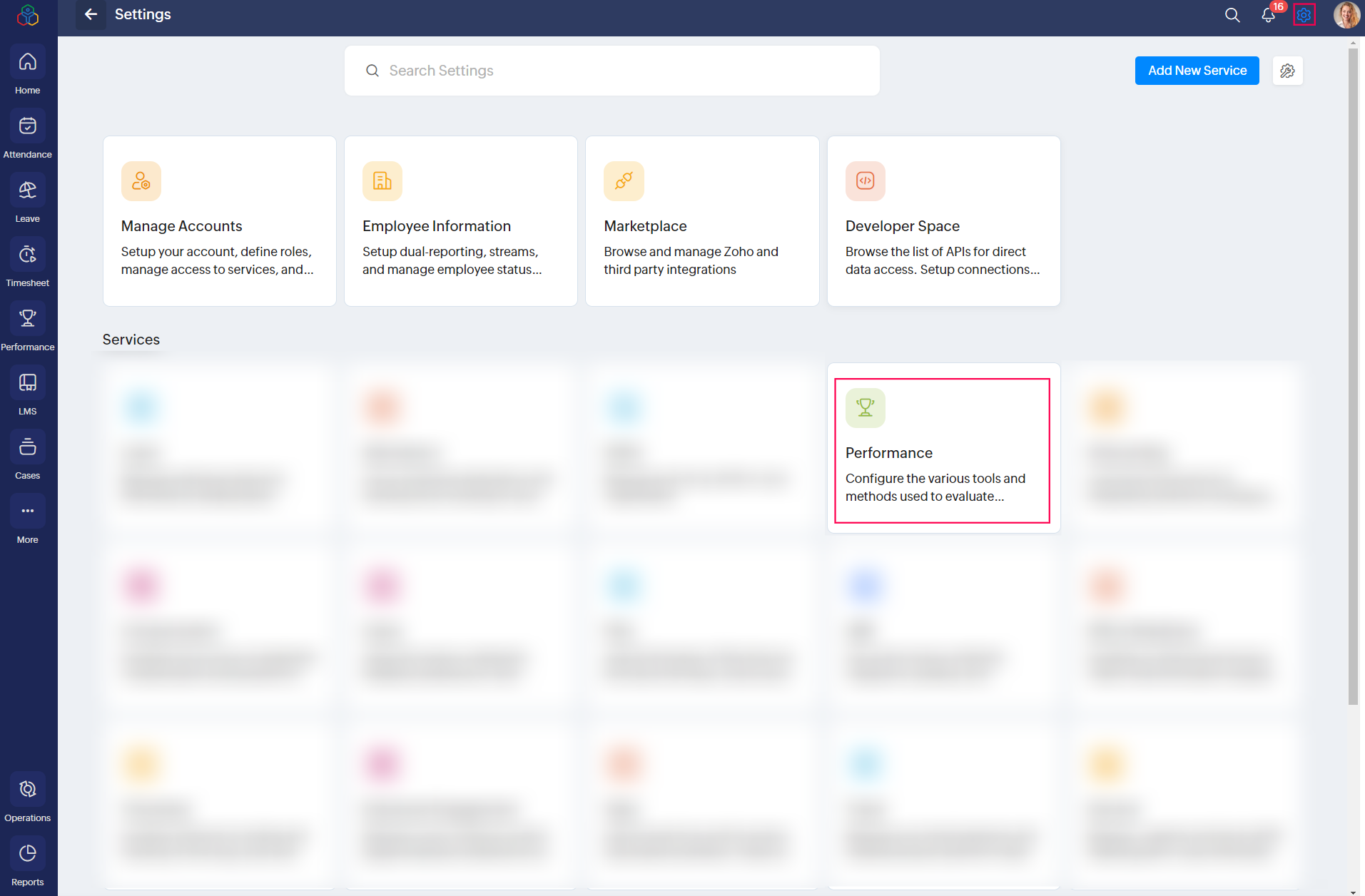 To access Performance service settings, go to Settings (gear icon on the top-right corner) > View All Performance (Visible only to Super Administrator and roles with Administrative Access).