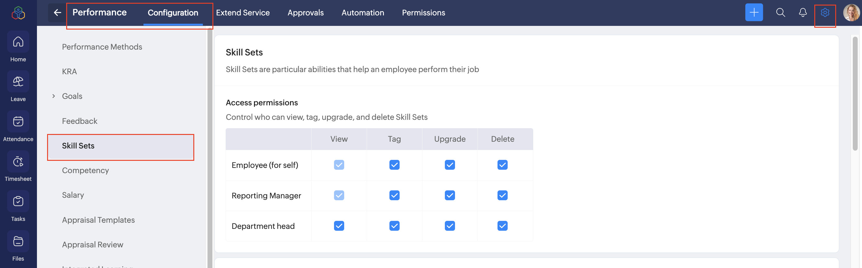 To configure Skill Set Settings, navigate to Settings > Performance > Configuration > Skill Set.