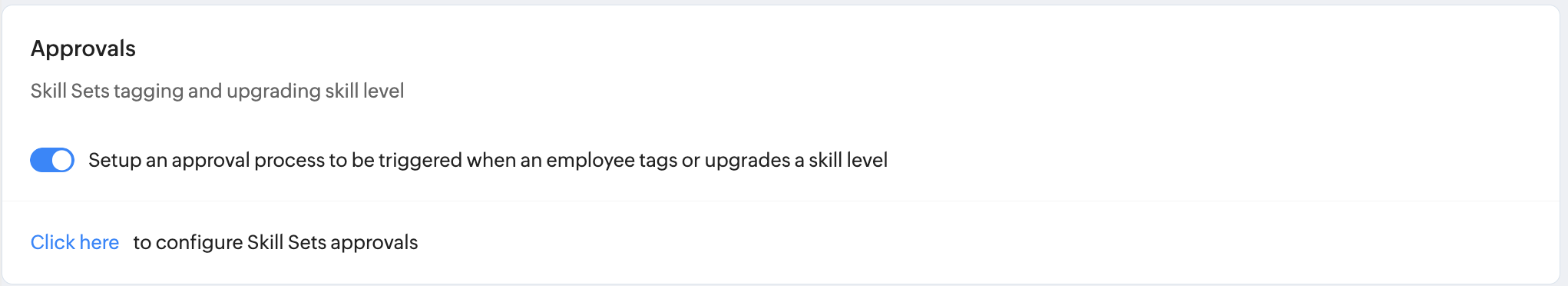 Enable and configure approvals to trigger approval workflow when a skill is tagged or upgraded by employees. To configure approvals, refer to Approvals - Overview & Use Cases