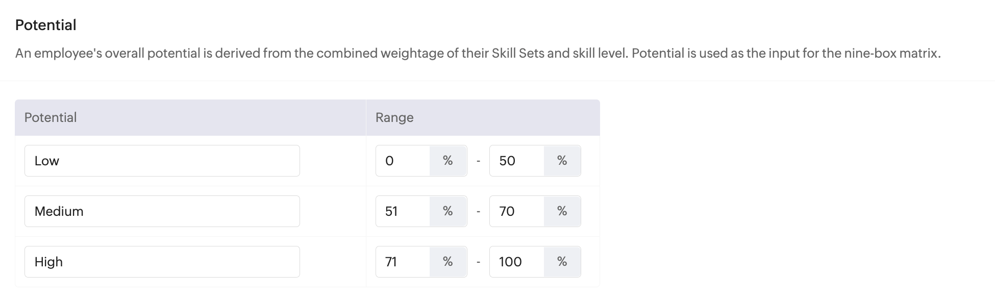 "Potential" is derived by combining the weight of employee's skill set and their skill level. This potential serves as the input for the nine-box matrix. Setup the potential levels and their corresponding range here.