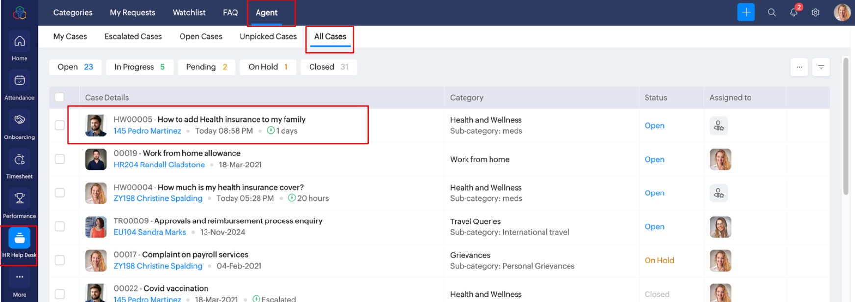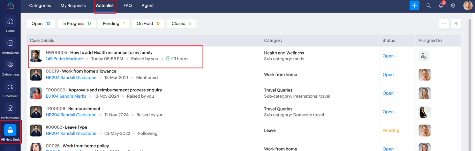 - Navigate to Watchlist tab or HR Help Desk > Agents > All Cases if your have raised case for other employees.